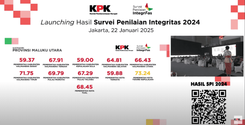 TIDORE – Kota Tidore Kepulauan berada pada urutan pertama dengan nilai 73,24 berdasarkan hasil Survey Penilaian Integritas (SPI) Kabupaten/Kota di Provinsi Maluku Utara oleh KPK RI Tahun 2024, meskipun nilai tersebut berada pada kategori kuning atau waspada, namun capaian ini merupakan skor tertinggi dari sembilan Kabupaten/Kota lainnya, termasuk Provinsi Maluku Utara yang berada pada kategori merah atau rentan.